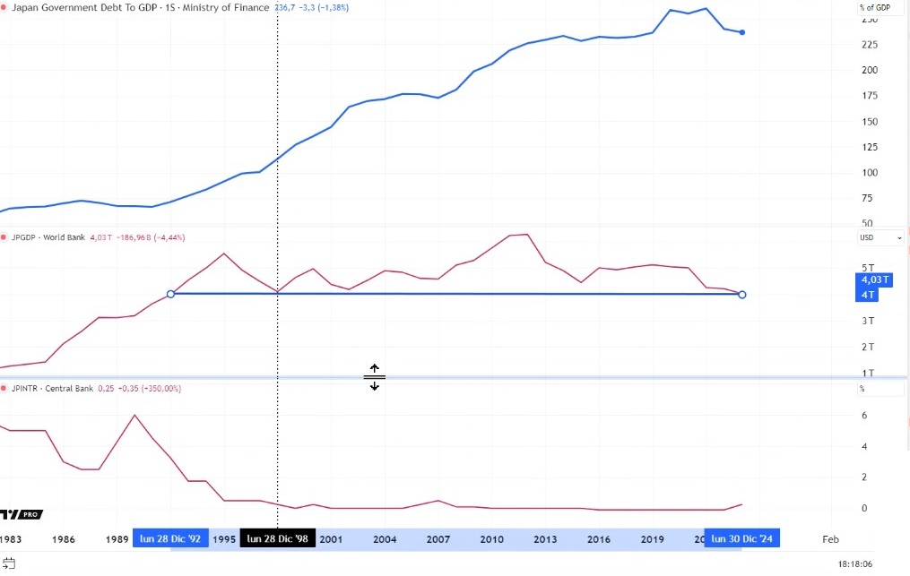 Como se ilustra en la siguiente imagen, la deuda sobre PIB de Japón a día de hoy supera el 230% del PIB y su PIB cerró 2024 en niveles de 1992.